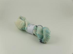 Ett handfärgat sockgarn i vitt, ljust turkos och inslag av gråblått.