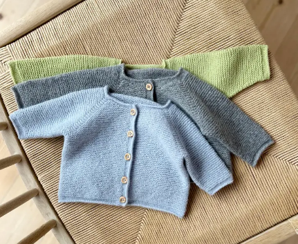 Mönster på en enkel rätstickad babykofta som stickas i Lun merino.
