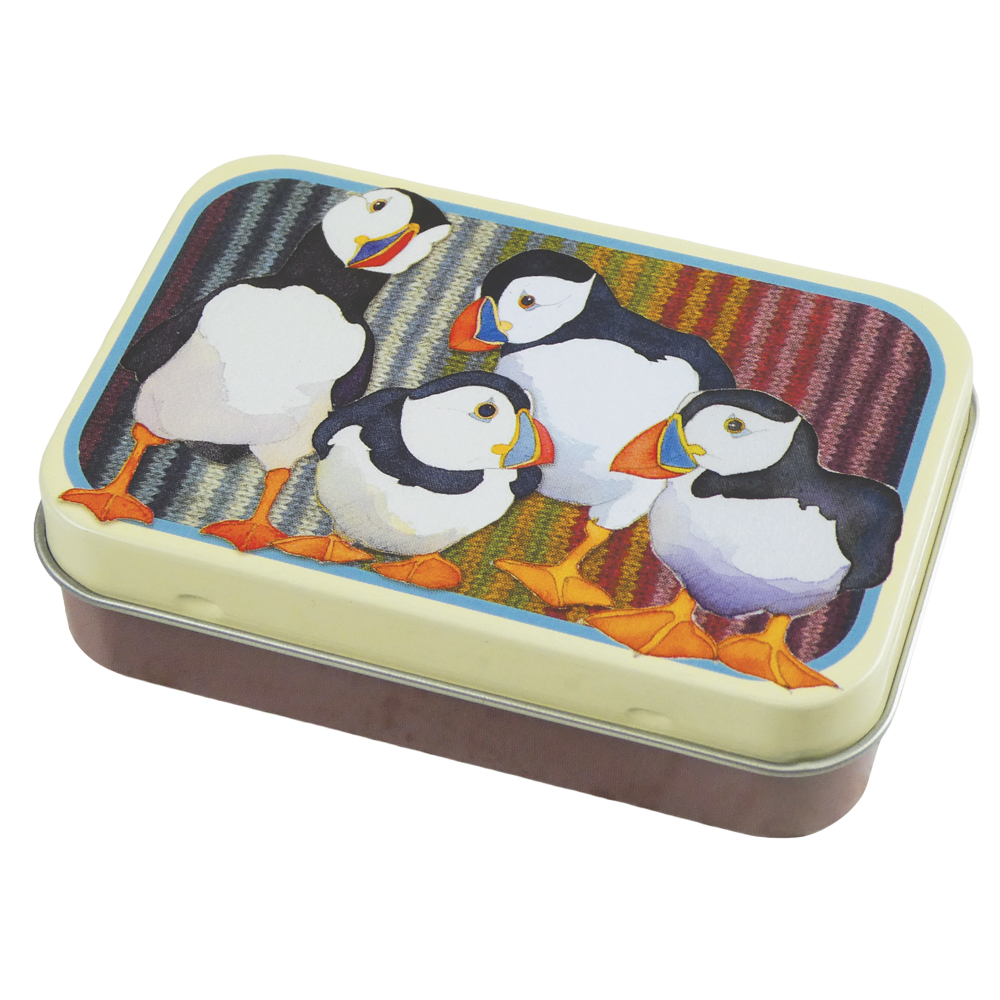 Söt plåtask perfekt för att förvara till exempel en liten sax, måttband och nålar i. Mäter 9,2x7,2x2,6cm