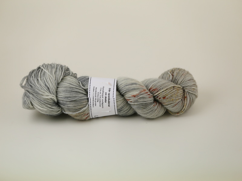 100g handfärgat sockgarn i gråbeige med stänk av rost.